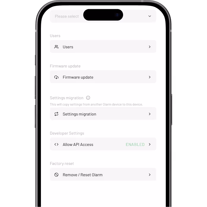 In the Olarm APP: View Profile → Devices → Select Device→ Allow API Access.