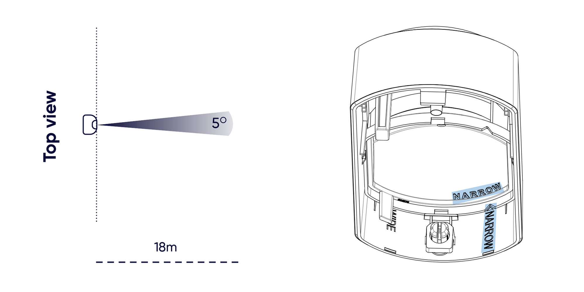 Narrow mode coverage (Switch lens around) Best for corridors, doors, narrow walkways or across multiple points of entry.