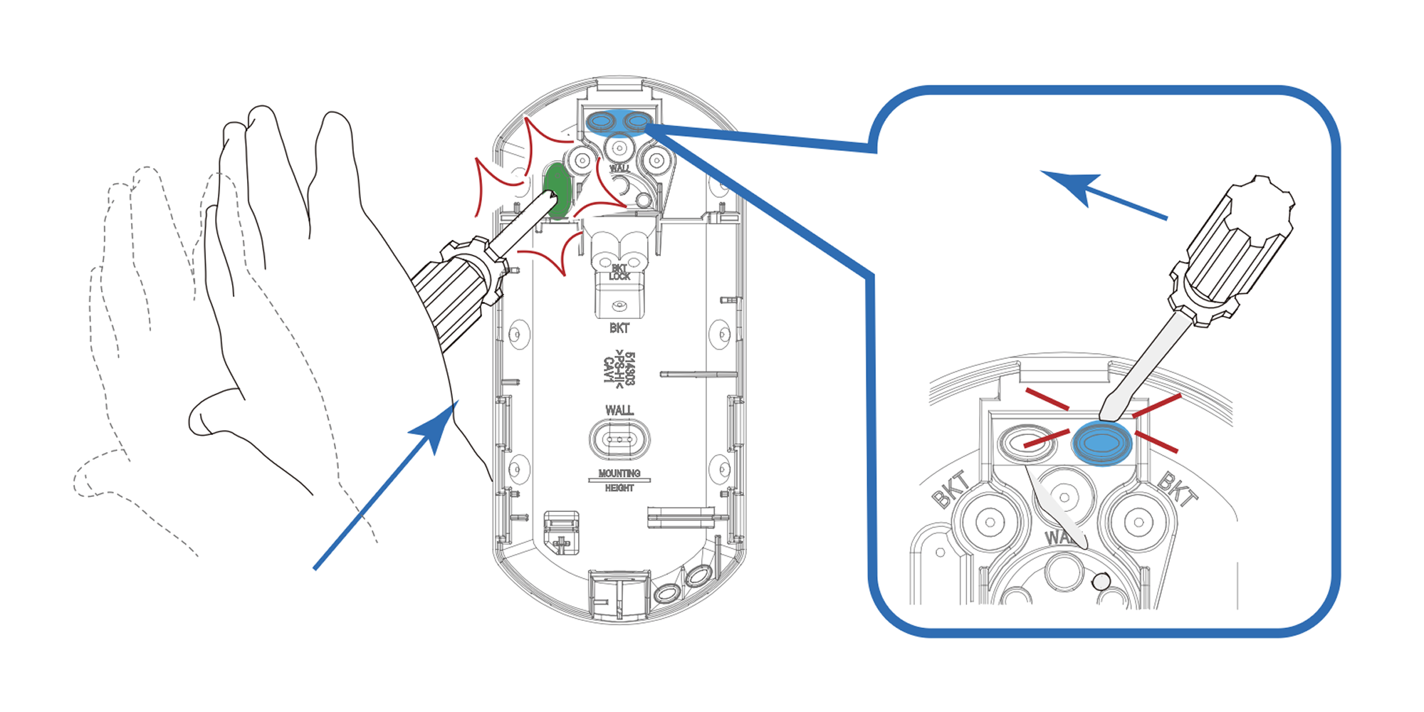 Using a Phillips screwdriver, puncture the screw slots marked “BKT” & “BKT LOCK”.