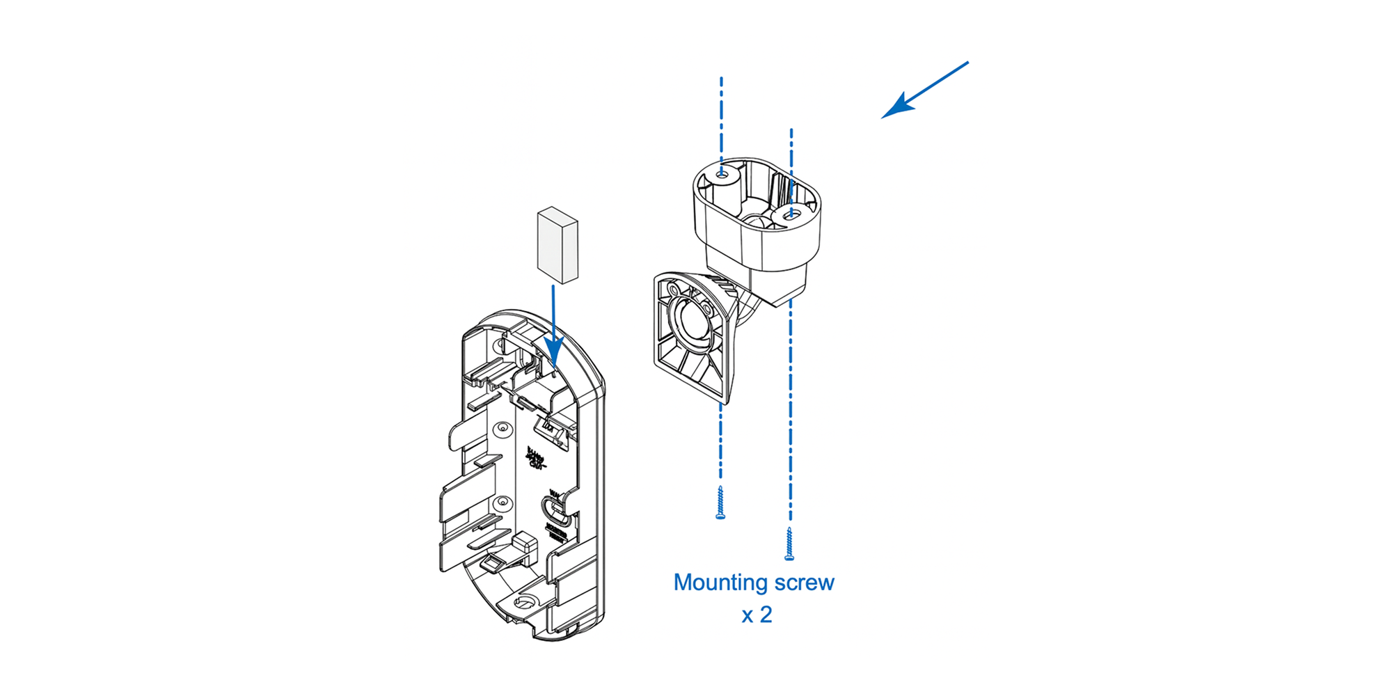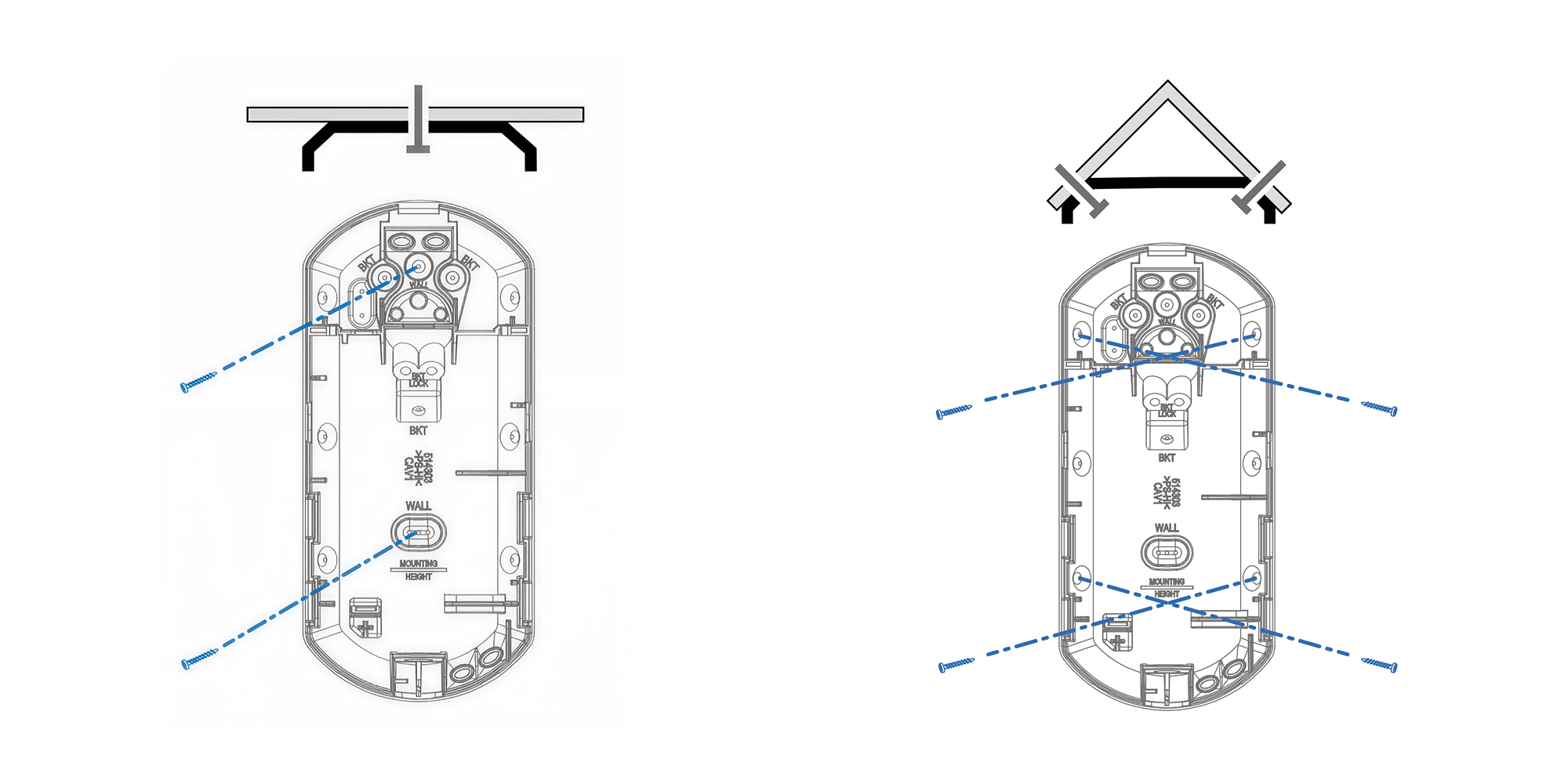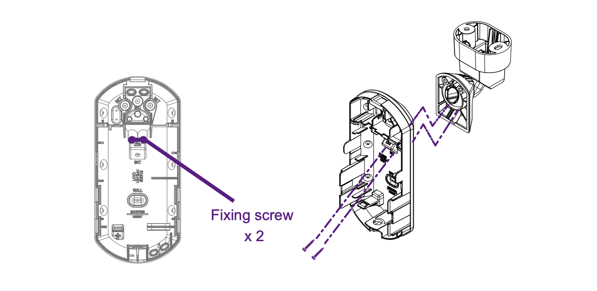Using the screws provided, fasten the Olarm FlipX detection angle in place using the “BKT LOCK” screw slots.