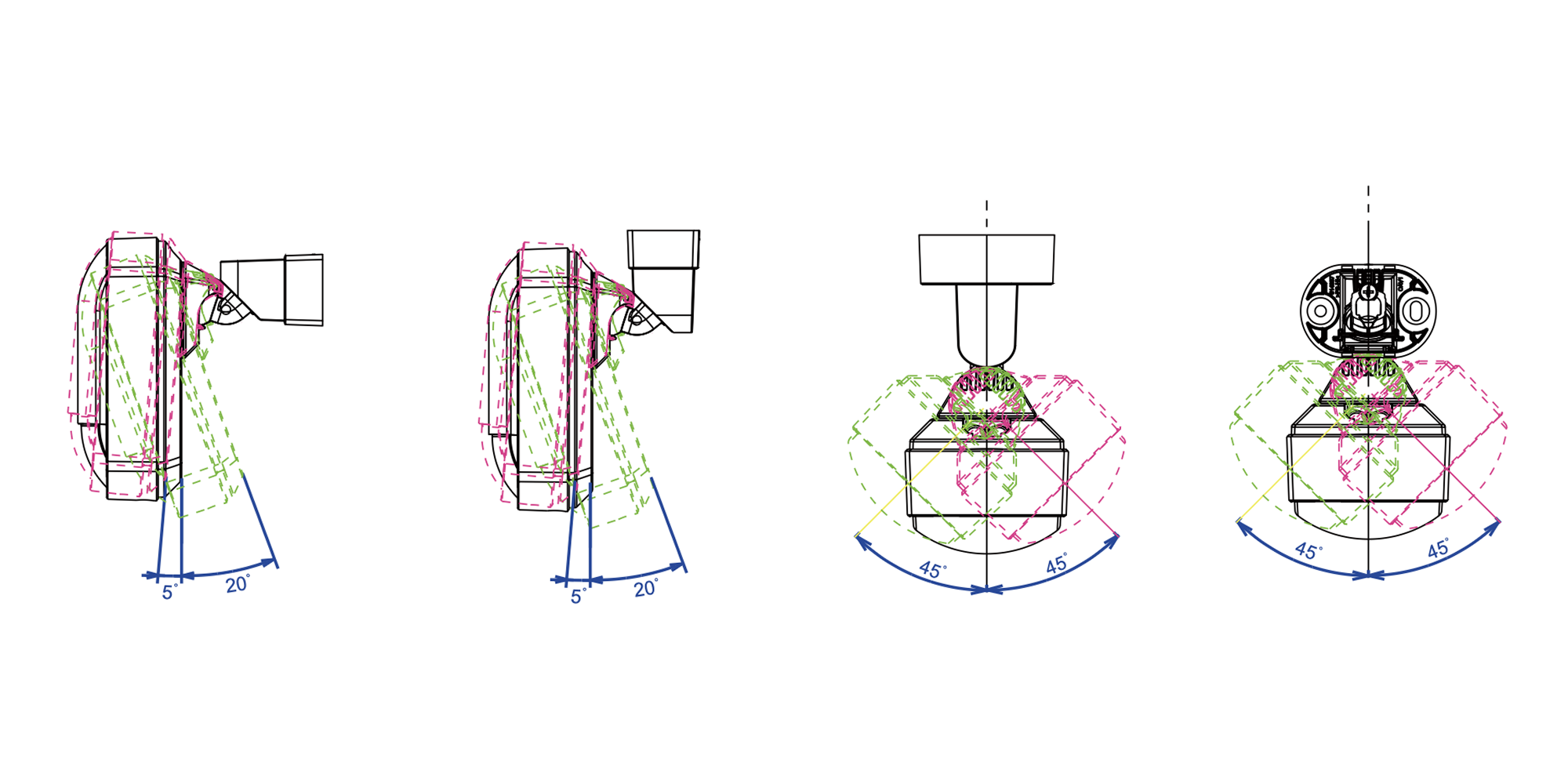 The Olarm FlipX can be adjusted 5 degrees up and 20 degrees down, as well as 45 degrees left or right.